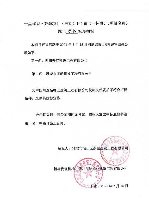 十里梅香茶源項(xiàng)目(三期)164畝施工總承包一標(biāo)段施工勞務(wù)標(biāo)段評審公告