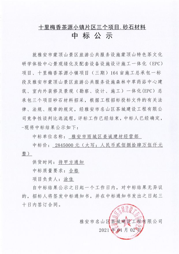 十里梅香茶源小鎮(zhèn)片區(qū)三個項目砂石材料中標(biāo)公示