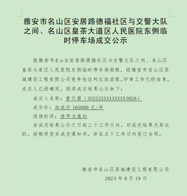 雅安市名山區(qū)安居路德福社區(qū)與交警大隊之間、名山區(qū)皇茶大道區(qū)人民醫(yī)院東側臨時停車場成交公示